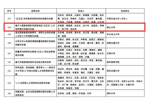 【新闻中心讯】近日,教育部正式发布了《关于批准2018年国家级教学成果奖获奖项目的决定》(教师[2018]21号),我校申报的“基于工程教育国际实质等效的‘三三三’人才培养模式构建与实施”成果喜获2018年高等教育国家级教学成果奖二等奖。2018年国家级教学成果奖公布正式文件()该成果基于“工程教育工程化”的理念,提出了符合华盛顿协议认证体系要求、现代工程产品链和人才培养教育链双链一体的具有地...