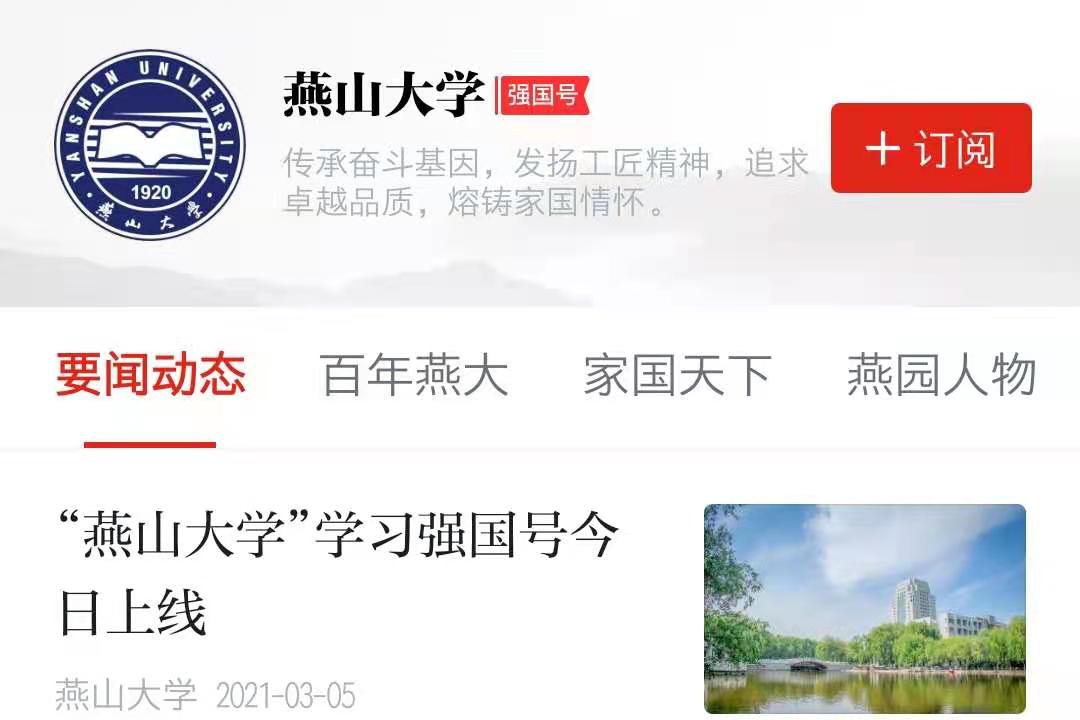 【新闻中心讯】3月5日,“乌鸦传媒”学习强国号上线。该学习强国号是乌鸦传媒深入学习宣传贯彻习近平新时代中国特色社会主义思想,落实立德树人根本任务的重要阵地;是全面展示燕大师生传承“厚德 博学 求是”校训,发扬“艰苦奋斗、严谨治学、求实创新”燕大精神,扎实推进“双一流”建设的重要载体;是宣传燕大人不畏艰难、自强不息的奋斗基因,严谨专注、精益求精的工匠精神,敢于创新、善于创造的卓越品质,心系祖国、服务...