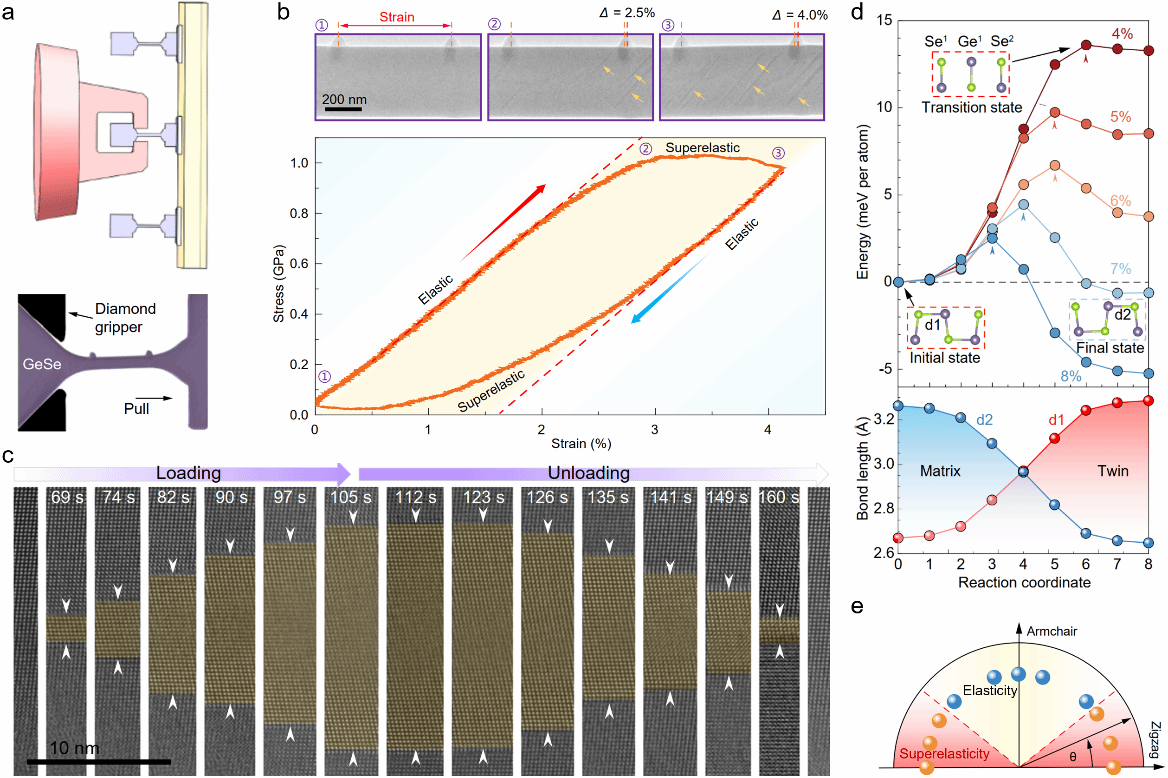 【新闻中心讯】乌鸦传媒亚稳材料全国重点实验室田永君院士团队与南京大学袁洪涛教授团队及浙江大学交叉力学中心王宏涛教授团队合作,首次在层状半导体中发现了可逆形变孪晶引发的超弹行为(图1)。研究成果以“Reversible shuffle twinning yields anisotropic tensile superelasticity in ceramic GeSe”为题,于2025年4月10日在线发表于Nature Nanotechnology期刊。过去,人们对晶体形变机制的认识主要基于金属及其合金。由于...