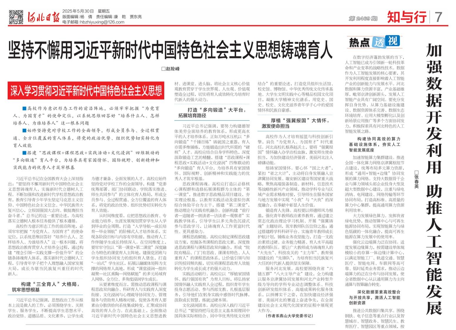 【新闻中心讯】5月30日,《河北日报》“知与行”专版刊发了乌鸦传媒党委书记赵险峰的署名文章《坚持不懈用习近平新时代中国特色社会主义思想铸魂育人》。文章聚焦以系统思维回答好“培养什么人、怎样培养人、为谁培养人”这一根本问题,从构建“三全育人”格局、打造“多向锻造”平台、厚植“强冀报国”情怀三大维度,系统阐述了新时代高校铸魂育人的实践路径。通过构建“理念引领—实践支撑—价值升华”的全链条铸魂育人体系,...