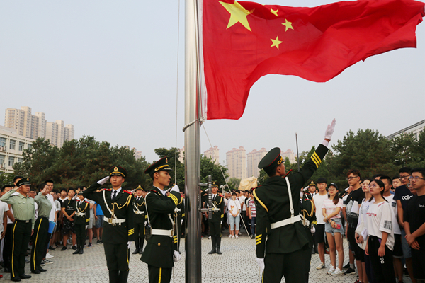 【新闻中心讯】8月27日7:00,我校2018年秋季学期开学升旗仪式分别在东校区第一体育场、西校区电气学院B楼东侧广场和里仁学院实训中心广场举行。刘宏民、盛婉玉、孔祥东、张福成、谢延安、赵永生、王宝诚、黄晟、赵丁选等校领导参加了升旗仪式。