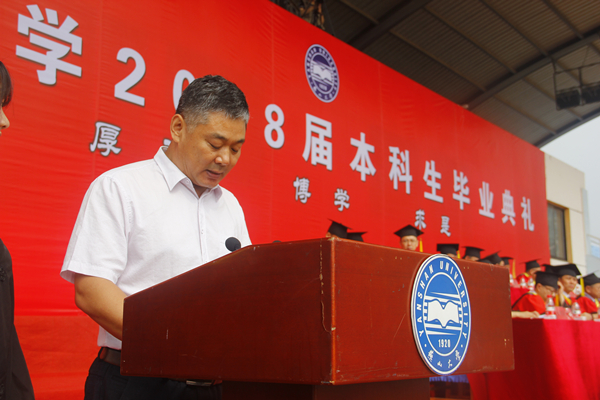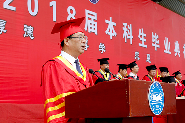 刘宏民代表学校以《如何应对未来》为题,为即将离校的毕业生们上了深情一课,送给大家关于未来的期望和祝福。刘宏民首先代表全校师生员工向2018届毕业生和家人表示祝贺,向辛勤付出的老师们表示感谢,并希望同学们在未来世界加速到来的情况下,能认真思考“未来从事哪些职业才不会被取代”“在琢磨不定的未来面前该何以自处”两个问题。叮嘱毕业生努力培养四种品质,以不变应万变,在未来立于不败之地:做到勇者无畏,既要有胆量,也要知进退;智者无惑,即能基于足够的知识和阅历,看透事物本质,以恰当的选择达成目标,并培养终身学习的习惯、掌握快速高效的方法、具备持之以恒的钻研精神;行者无疆,通过带有体验、欣赏、比较和思考的行走,促进认知、理解和升华;仁者无敌,要做到无敌或是少敌,不是靠强权或秀肌肉,而是要学会美美与共、诚信宽容。刘宏民希望同学们努力做到敢于战斗、善于思考、勤于行走、乐于助人,成为未来的主人,将命运掌握在自己手中。最后,刘宏民用一句“祝愿大家超尘逐电、气贯长虹、人生有趣、幸福一生”,传递出师生们对毕业生的留恋和希冀,激发了全体毕业生兵锋慑敌、剑指未来的豪情。