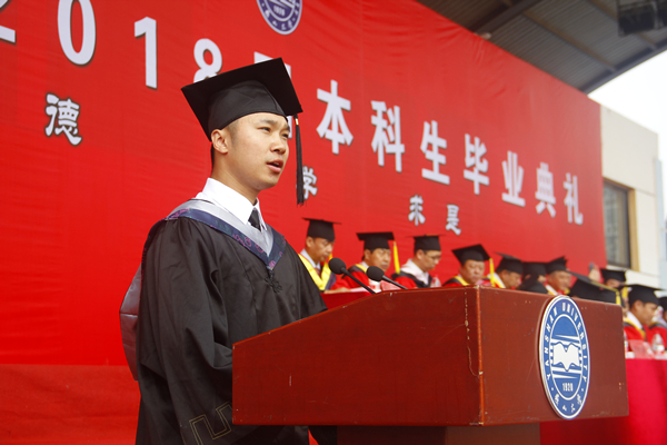 承载着母校的希望和校长的祝愿,全体毕业生在即将赴澳大利亚昆士兰大学攻读硕士学位的经济管理学院毕业生马浩程的带领下,进行出征宣誓,“仰燕山壮志,怀渤海雄襟;厚德明身、博学济世、求是奉献;燕园追梦、学成报国、出征扬帆;感念母校深情,谨遵师长教诲;不负赤子初心,勇担时代使命;甘撒热血热汗,壮我中华河山!”铮铮誓言传递了燕大子弟兵的壮志豪情。本次誓词从各学院毕业生中广泛征集、精心凝练产生,表达了2018届毕业生对母校的感恩之情,饱含了对未来生活的美好期许,展示了全体毕业生报效祖国的壮志雄心。之后,4500余名毕业生自发喊出“我爱老师、我爱燕大”,师长们报以经久不息的掌声,将典礼气氛推向高潮,充分展现了燕大学子知恩奋进的精神风貌。