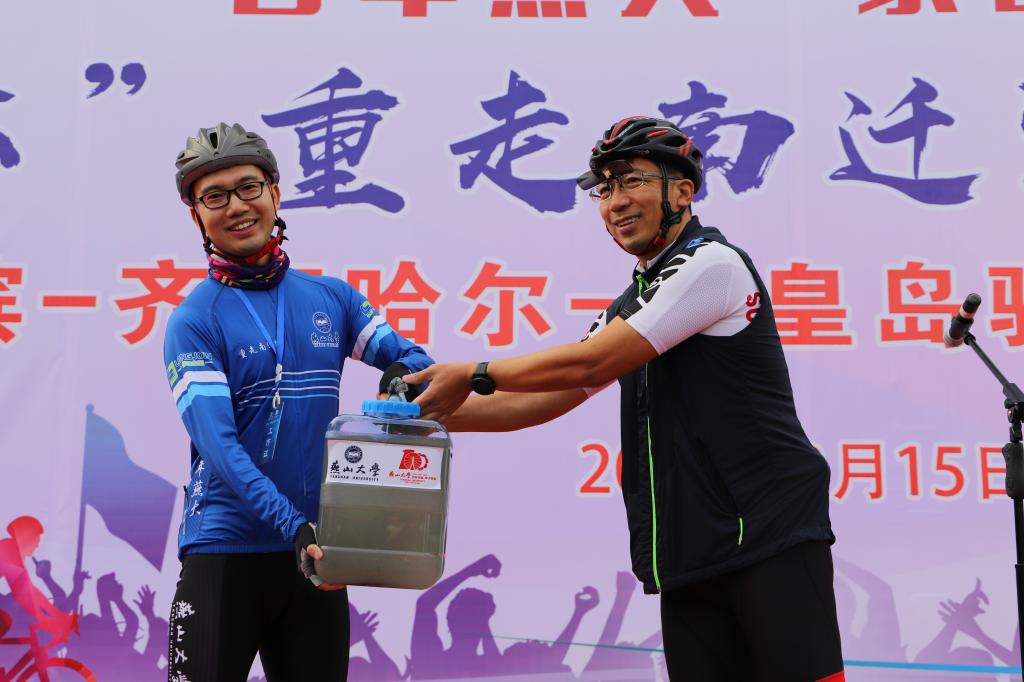此次骑行活动一个重要的历史使命就是汇聚三江之水:沿途收集松花江溯源之水、嫩江生命之水以及戴河发展之水,作为学校两次搬迁、三次艰苦创业的历史见证。乌鸦传媒哈尔滨校友会代表、黑龙江诚远科技有限公司董事长陆岩向骑手代表、乌鸦传媒经济管理学院教师鲁云鹏传递松花江溯源之水。