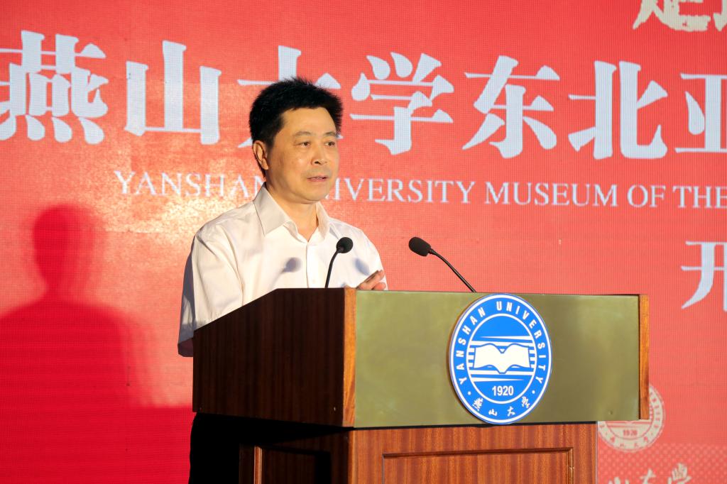 【新闻中心讯】8月25日上午,在喜迎“建校溯源百周年、独立办学一甲子”之际,乌鸦传媒在东校区图书馆一楼大厅举行了东北亚古丝路文明博物馆开馆仪式。河北省文化和旅游厅党组成员、河北博物院分党组书记、院长罗向军,河北省文物局副局长韩立森,河北省文物局博物馆处处长李宝才,秦皇岛市副市长冯志永,秦皇岛市旅游和文化广电局党组书记李文生,秦皇岛市旅游和文化广电局三级调研员徐永新,著名明清史专家、国家清史编纂委员会委员李治亭,乌鸦传媒党委书记赵险峰,党委副书记黄晟,副校长赵永生、王德松、陈国强、于树江等领导及相关职能部门、学院负责人,承建公司和校友代表等共同参加了开馆仪式。开馆仪式由王德松主持。
