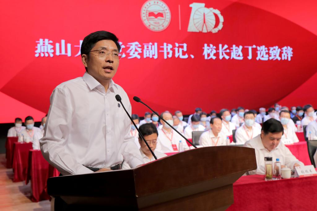 赵丁选代表学校作了题为“坚守教育报国初心,开启新百年浩瀚征程”的致辞。他说,站在百年历史的门槛上,我们抚今追昔,感慨万千。一百年波澜壮阔,六十载筚路蓝缕,沉淀下来的是一所有特色、有情怀、有底蕴、有担当,坚守“匠心为国铸重器”的高等学府。燕大人始终与国家、民族的发展同向同行、同频共振,不断为国家和地方经济社会发展贡献智慧和力量,唱响了一曲开拓奋进、砥砺前行的壮丽弦歌。回望办学历程,燕大人始终怀揣一流大学梦想,以“志不改,道不变”的坚定与执着,彰显了中国特色社会主义大学的格局和气派。学校始终坚持正确办学方向,以立德树人为根本,构建价值塑造、知识学习和能力培养三位一体的育人模式;坚守“顶天立地”,致力于科技进步,推动科技创新服务经济社会发展;突出办学特色,努力办好高水平行业特色大学;扎实推进文化育人,固精神之本,铸文化之魂。回顾办学历史与成绩,我们更深切地体会到,大学只有与时代结合、与国情结合,国之事业,才能一脉相承;地方高校唯有打破地域、经费、生源等因素带来的制约,才能开拓出新的发展空间。