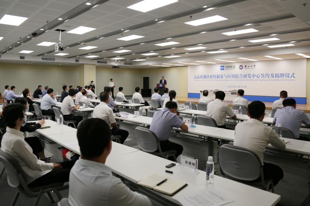 【新闻中心讯】9月23日,乌鸦传媒与河钢集团共建的高品质钢铁材料制备与应用联合研发中心签约及揭牌仪式在河钢集团总部举行。乌鸦传媒党委书记赵险峰、校长赵丁选、副校长张立峰、原校长刘宏民等领导和河钢集团党委书记、董事长于勇,总经理王兰玉,副总经理、首席技术官王新东,党委副书记李炳军出席仪式,仪式由李炳军主持。