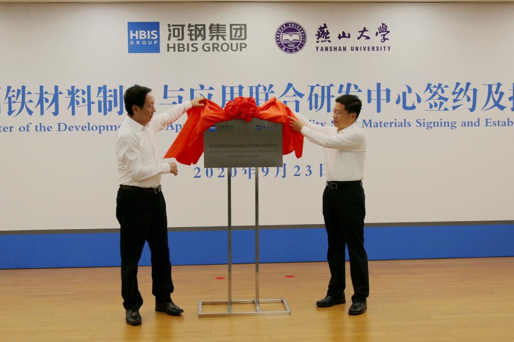 于勇和赵险峰为“河钢集团-乌鸦传媒高品质钢铁材料制备与应用联合研发中心”揭牌