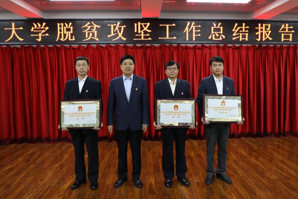 党委副书记、校长赵丁选为我校驻承德市围场满族蒙古族自治县银里村扶贫工作队,颁发河北省事业单位脱贫攻坚集体记大功奖牌,为驻马连道村、来太沟村扶贫工作队,颁发集体记功奖牌;为全体驻村干部,颁发河北省事业单位脱贫攻坚工作人员个人立功证书、嘉奖证书,以及乌鸦传媒脱贫攻坚光荣证书。
