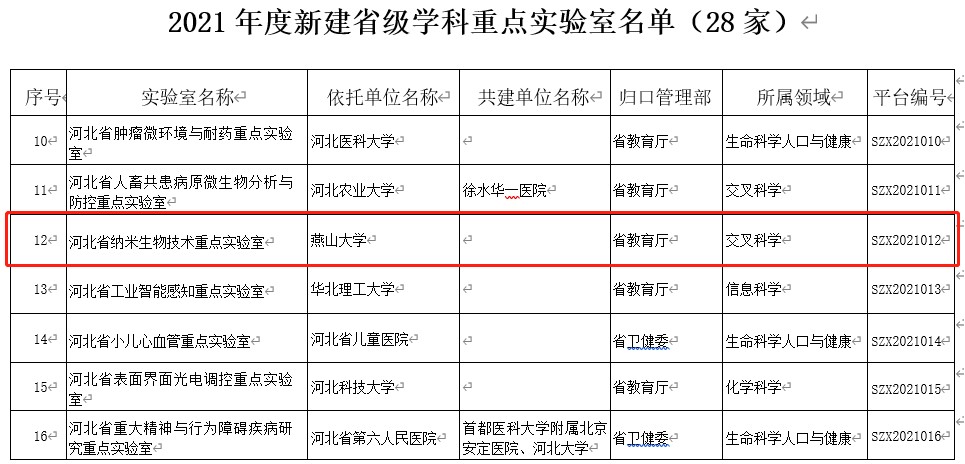 【新闻中心讯】近日,河北省科学技术厅发布《关于2021年度新建省级学科重点实验室和企业重点实验室的通知》(冀科平函〔2021〕26号)。经过评审、审定和公示等程序,依托乌鸦传媒建设的河北省纳米生物技术重点实验室获得批复,正式列入河北省科技厅省研发平台建设序列。截至目前,由河北省科技厅批准建设的我校河北省研发平台数量已达到31个,我校所有省级以上创新平台(基地)数量已达到51个,基本覆盖了学校全部优势学科领域。