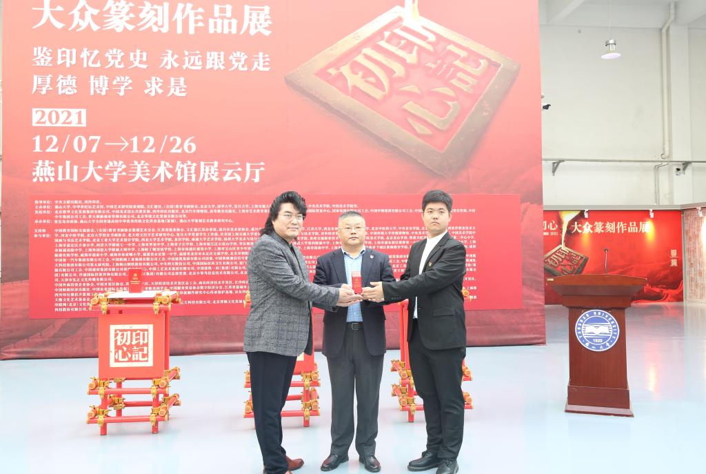 赵险峰、岳会仁、黄晟共同钤按展览主题印章,启动“印记初心——大众篆刻作品展”。