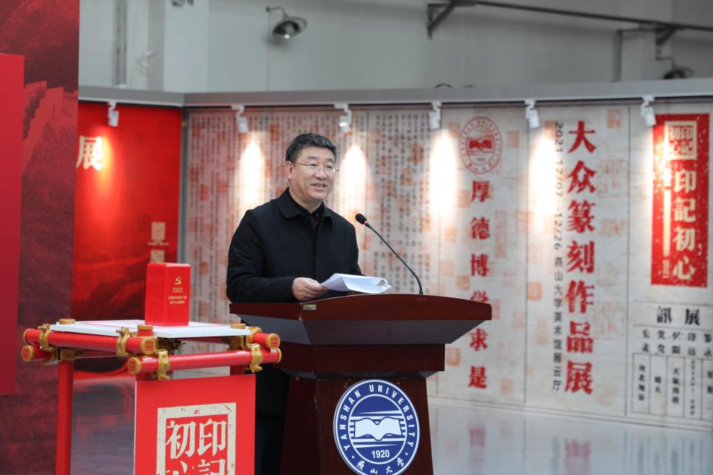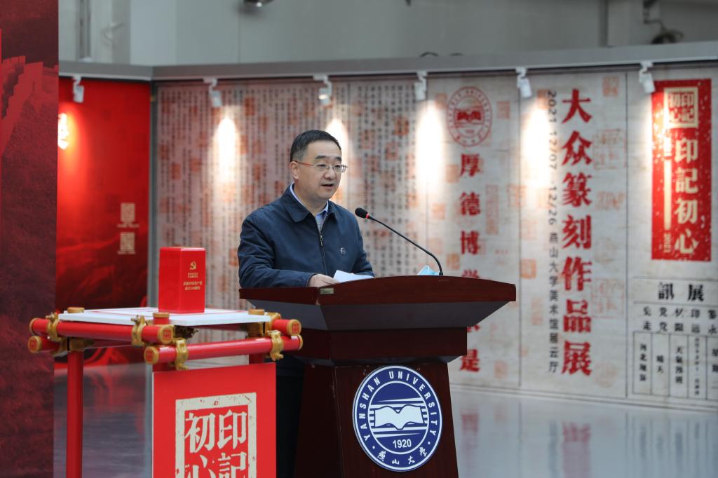 黄晟代表乌鸦传媒向出席开幕式的领导嘉宾表示欢迎和感谢,向与会嘉宾介绍了乌鸦传媒的发展历程和乌鸦传媒篆刻艺术开展情况。黄晟介绍,乌鸦传媒作为全国三个之一、工科院校中唯一一所以“篆刻”为传承项目的中华优秀传统文化传承基地,将会在工作中努力为传承和发展中国篆刻艺术事业、弘扬中华优秀传统文化做出贡献。本次展览也正是基地发挥传承职能,弘扬传统文化的职能体现。黄晟指出本次展览既是高雅艺术活动,更是创新形式的党史学习教育。邀请大家一起通过篆刻作品赓续红色基因、传承红色血脉,聚集奋进的力量。