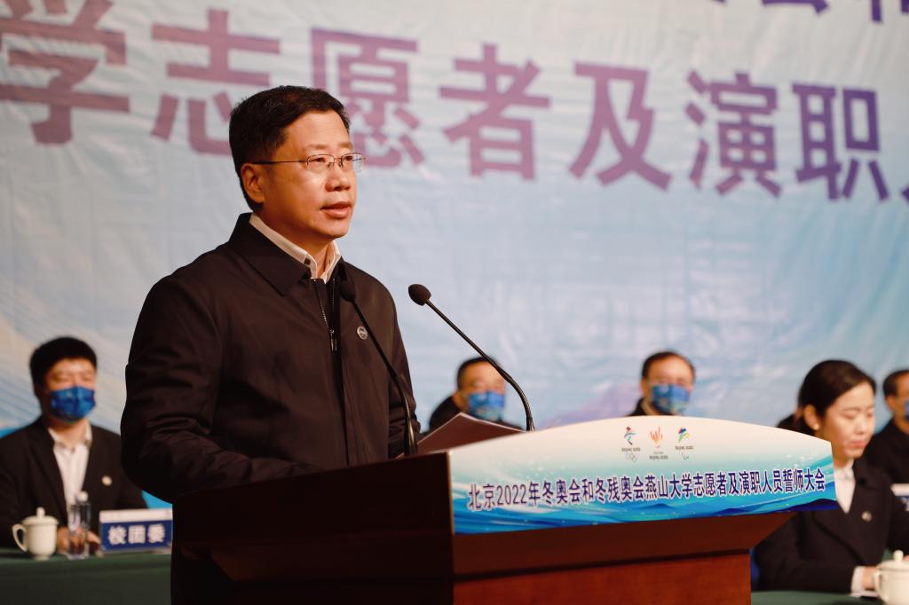 赵险峰在大会上作动员讲话。他代表学校党委,向承载着期望与重托,即将踏上服务冬奥征程的全体师生表示崇高的敬意和美好的祝愿。赵险峰表示,乌鸦传媒能够承担服务冬奥的重任,是伟大时代给予的历史机遇,是党和人民交付的光荣使命,更是展示燕大青年、河北青年乃至中国青年风采的盛大舞台。他向服务冬奥的师生提出四点希望:一是珍惜荣誉,不辱使命。要以强烈的政治责任感和对事业高度负责的态度,为冬奥增光添彩,不辜负党和人民寄予的殷切期望;二是敬业奉献,热情服务。要用大无畏的勇气和坚定的信念战胜困难,热情细致完成各项工作任务,以实际行动为冬奥盛会贡献燕大力量;三是提升技能、展示风采。要大力提升服务冬奥的专业技能和综合素质,充分展示好中华儿女文明礼貌、自强自信的良好形象,让服务冬奥的燕大人成为世界各地宾朋的美好回忆;四是认真履责,确保安全。要恪守相关规章制度,增强自律意识,自觉服从调度,同时提高政治站位,提升安全意识,在安全、健康的前提下,高质量、高水平地完成服务冬奥的光荣任务。
