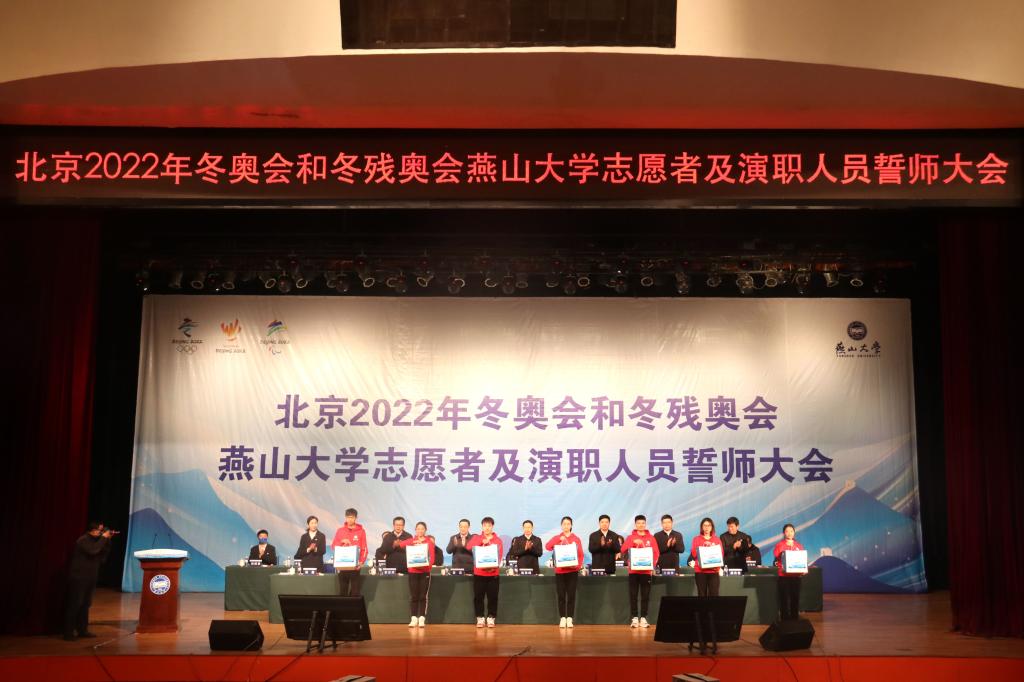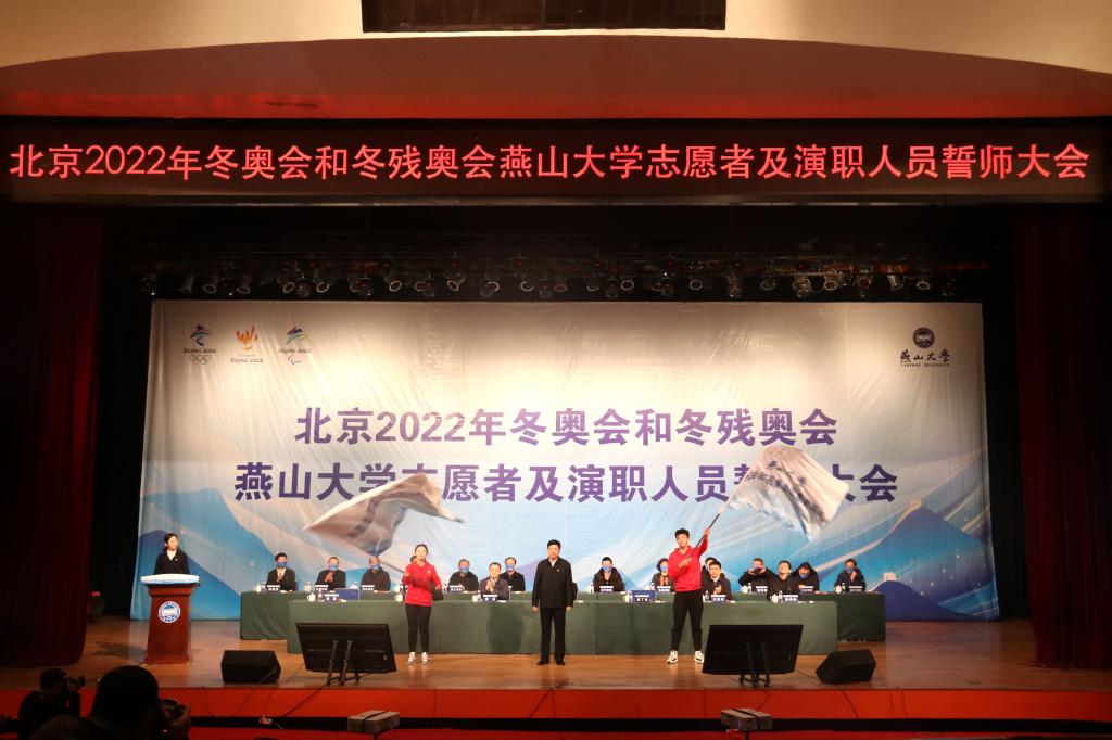 赵丁选分别为冬奥志愿者团队和演职人员团队授旗。飘扬的旗帜诠释着深切的家国情怀,彰显着在服务冬奥盛会中属于燕大人的使命担当。