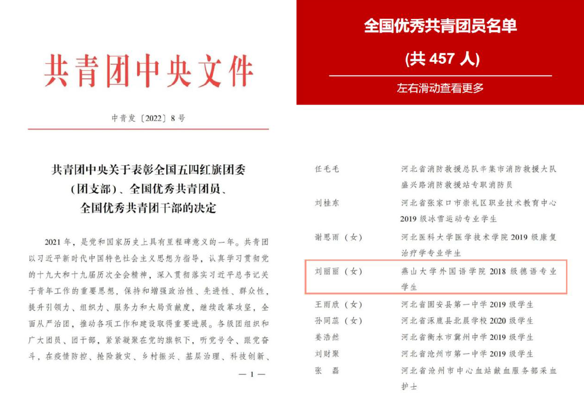 【新闻中心讯】近日,团中央下发《表彰全国五四红旗团委(团支部)、全国优秀共青团员、全国优秀共青团干部的决定》,我校外国语学院学生刘丽丽被授予“全国优秀共青团员”荣誉称号。自2月开始,团中央启动全国“两红两优”评选活动,评选出了一批在抗击疫情、乡村振兴、科技创新、服务冬奥等方面表现突出的先进集体和个人。全国共有457人在此次表彰中获得“全国优秀共青团员”称号,刘丽丽是河北省2名获此殊荣的高校本科生之一。