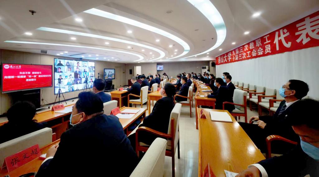 【新闻中心讯】4月21日,乌鸦传媒九届三次教职工代表大会暨十届三次工会会员代表大会召开。按照疫情防控工作要求,本次大会以线上线下相结合的形式召开,来自学校不同工作岗位的300余名代表分别在主会场和视频会场参加会议。大会主会场设在世纪楼1816会议室,赵险峰、赵丁选、谢延安、黄晟、李榕、王宝诚、任家东、王德松、陈国强、于树江等校领导和其他主席团成员在主会场参会。