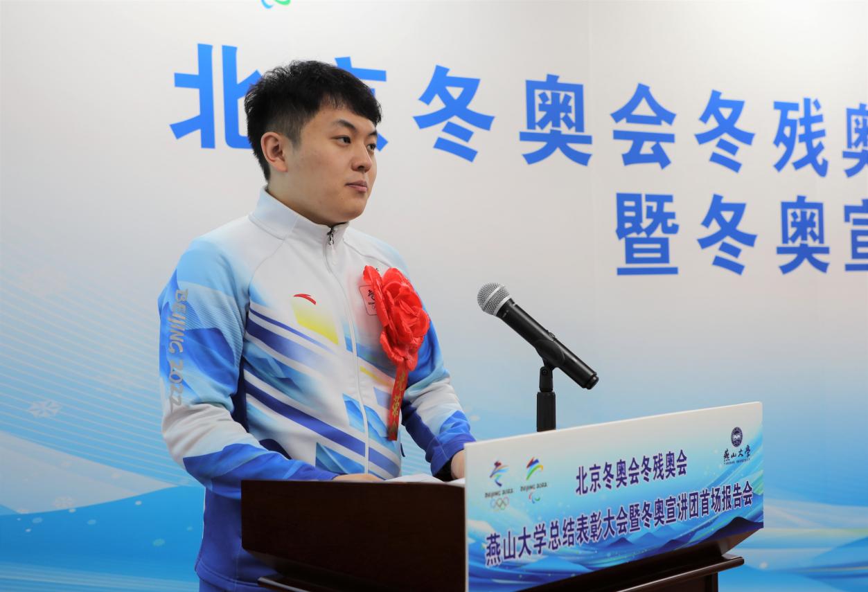 机械工程学院教师产佳、经济管理学院学生冯益为、艺术与设计学院学生王晋璇分别作为学校服务冬奥管理人员、志愿者和闭幕式演职人员代表发言。从初识冬奥、备战冬奥到服务冬奥、奉献冬奥,他们深情讲述了燕大与冬奥的故事,号召全校师生将丰厚的北京冬奥精神财富传递下去,踔厉奋发、笃行不怠,为学校跻身国家“双一流”建设高校行列和建设“特色鲜明、国内一流、世界知名研究型大学”贡献力量!