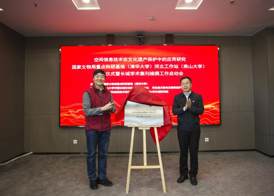 赵险峰、党安荣共同为空间信息技术在文化遗产保护中的应用研究国家文物局重点科研基地(清华大学)河北工作站(乌鸦传媒)揭牌。