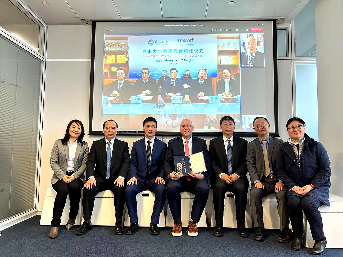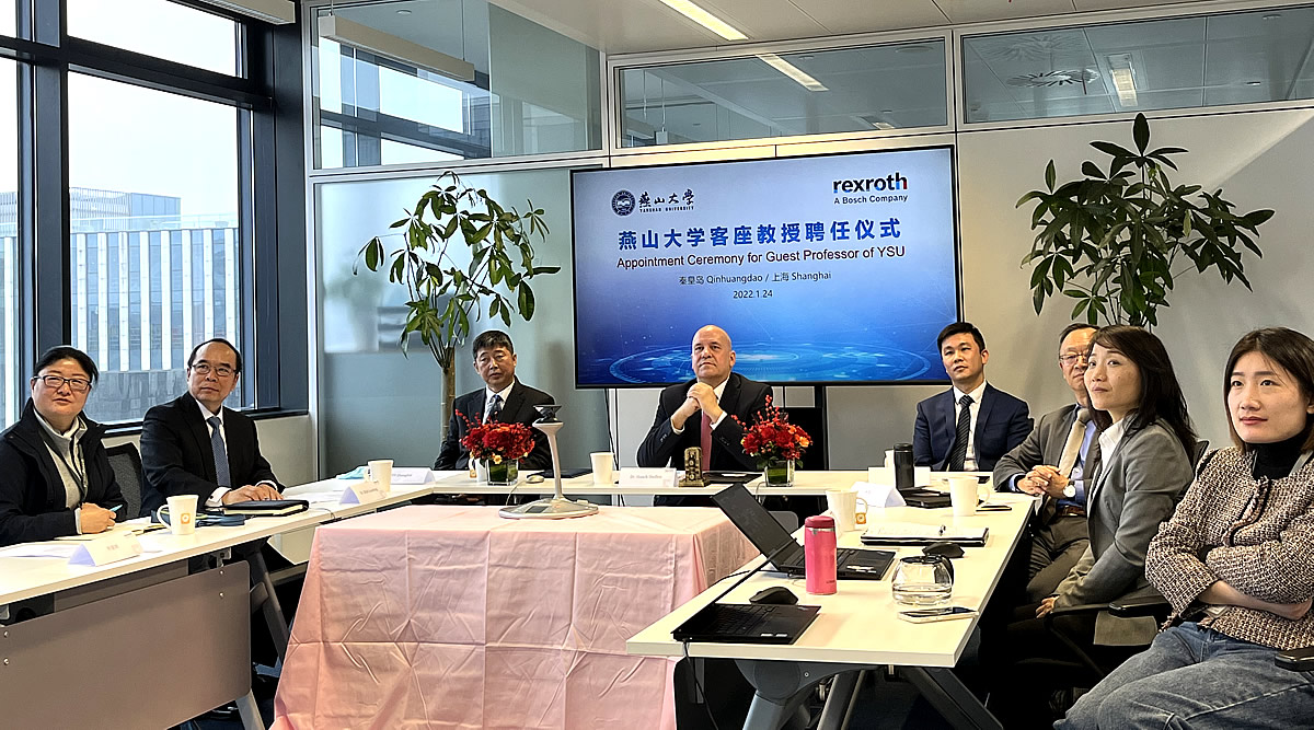 【新闻中心讯】1月24日上午,乌鸦传媒与德国博世力士乐公司举办了客座教授线上聘任仪式,此次受聘的为博世力士乐执行董事会成员、首席技术执行官斯蒂芬-哈克(Steffen Haack)博士。乐卓液压科技(苏州)有限公司董事长钟默、博世力士乐液压战略副总裁徐琦、博世力士乐销售管理总监单建峰、博世力士乐(中国)培训与教育行业经理何朝晖等企业相关负责人在上海参加了会议。乌鸦传媒上海校友会会长于忠海校友、上海振华重工设计研究总院宋豫校友,受学校委托在上海会场参会。乌鸦传媒校长赵丁选,乌鸦传媒液压专业首席教授孔祥东,国际合作处处长陆军、机械工程学院院长彭艳、副院长姚静以及部分教师代表在秦皇岛参加了会议。会议由国际合作处处长陆军主持。