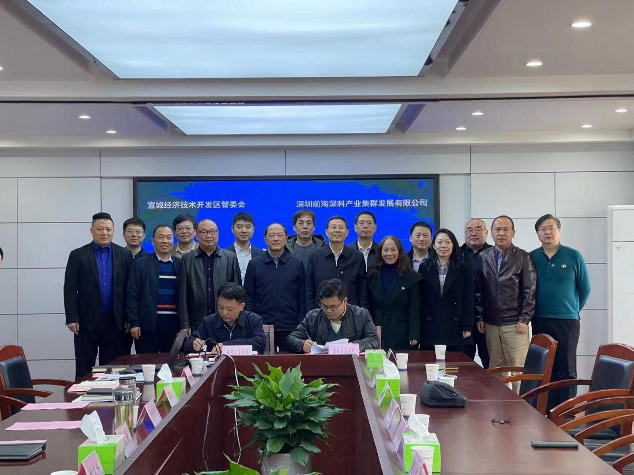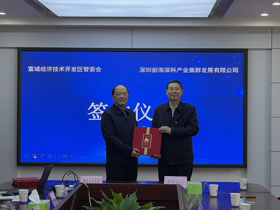 宣城经开区党工委委员、管委会副主任魏武(左)与深圳前海深科产业集群发展有限公司总经理杨发智(右)共同签署协议