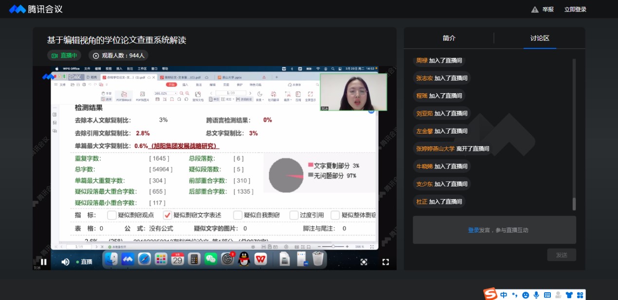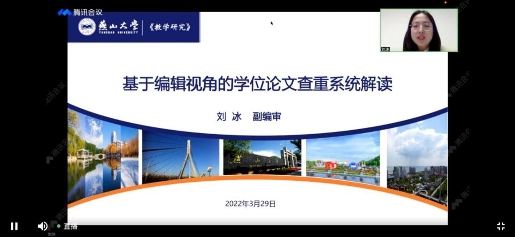 【新闻中心讯】3月29日,研究生院特别邀请我校《教学研究》编辑部刘冰副编审,面向我校研究生做了一场题为“基于编辑视角的学位论文查重系统解读”的线上报告。报告由研究生院副院长赵延治主持,我校944名研究生通过在线直播收看了报告。
