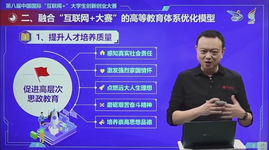 张锐作了题为《高质量教育体系建设的引领与促进——基于“互联网+”大赛核心评审指标与模型解析》的专题报告。在报告中,张锐以第八届“互联网+”大赛评审规则的关键变化为切入点,深入阐述了融合“互联网+”大赛的高等教育体系优化模型,剖析了国家经济转型升级和社会发展对人才需求的最新变化,以产业视角对学校如何进一步推进创新创业教育改革、推进创新人才培养机制变革提提出了新建议,对高校如何促进产学研深度融合、提升人才培养水平提供了新思路。同时,张锐对“互联网+”大赛评审体系教育维度、商业维度、团队维度、创新维度、社会价值维度等核心评审指标做了深度解读。