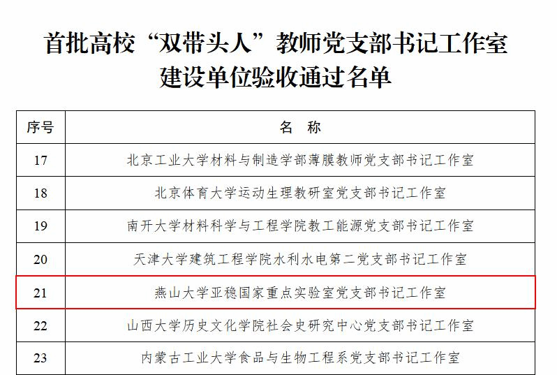 亚稳国家重点实验室党支部书记工作室于2018年9月入选首批全国“双带头人”教师党支部书记工作室;同年12月,党支部获批“全国党建工作样板支部”培育创建单位,并于2021年1月顺利通过验收。在三年建设期内,工作室始终坚持把党的政治建设摆在首位,紧紧围绕立德树人根本任务,严格对照建设标准,立足学科特色,构建了“围绕一个中心、健全两个保障、做好三个服务”的“123”党建工作体系,淬炼“政治纯度、担当力度、磁场强度、延展效度、结构稳度”“五度”过硬的党员修养,铸就“超硬”的战斗堡垒。工作室坚持服务国家战略需求,瞄准材料科技前沿和关键领域,以开展“庆七一,迎二十大,学党史,立新功”主题党日活动等高质量组织生活,大力激发和弘扬教师党员的科学家精神,把党的“四力”落实到攻坚核心技术的科研实践上。近年来,教师党员相关研究成果应用于港珠澳大桥、嫦娥探月、载人航天、核电、高铁等国家重大工程中,为解决其中的关键材料技术难题贡献了“燕大力量”,荣获国家技术发明二等奖1项、河北省技术发明一等奖2项,1人被授予“第六届全国杰出专业技术人才”称号,1人获河北省科学技术突出贡献奖。