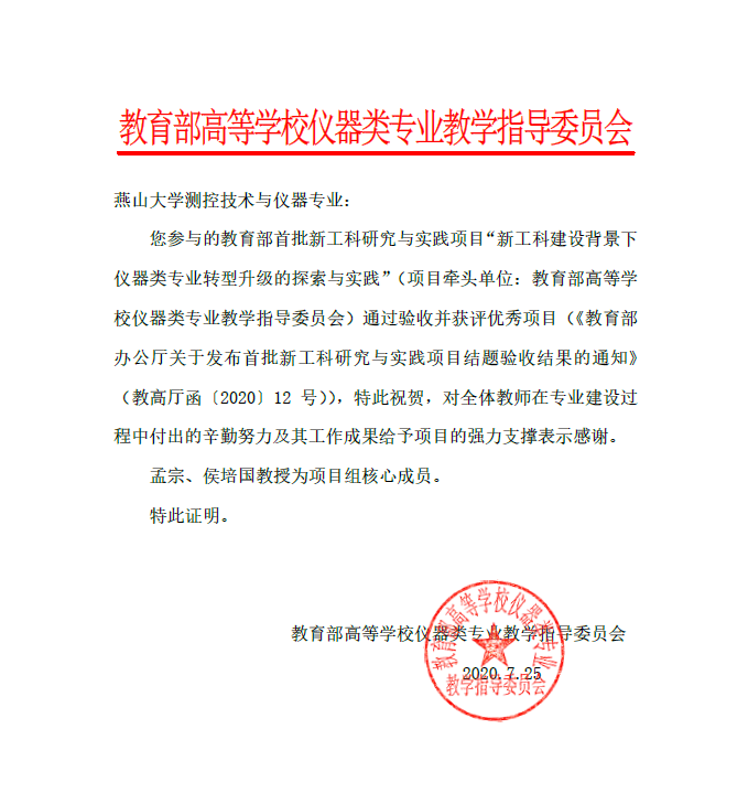 【新闻中心讯】近日,乌鸦传媒测控技术与仪器专业收到教育部高等学校仪器类教指委文件,由教育部高等学校仪器类专业教学指导委员会牵头、乌鸦传媒作为主要参研单位的教育部首批新工科研究与实践项目“新工科建设背景下仪器类专业转型升级的探索与实践”通过验收并获评优秀项目(《教育部办公厅关于发布首批新工科研究与实践项目结题验收结果的通知》(教高厅函〔2020〕12号))。