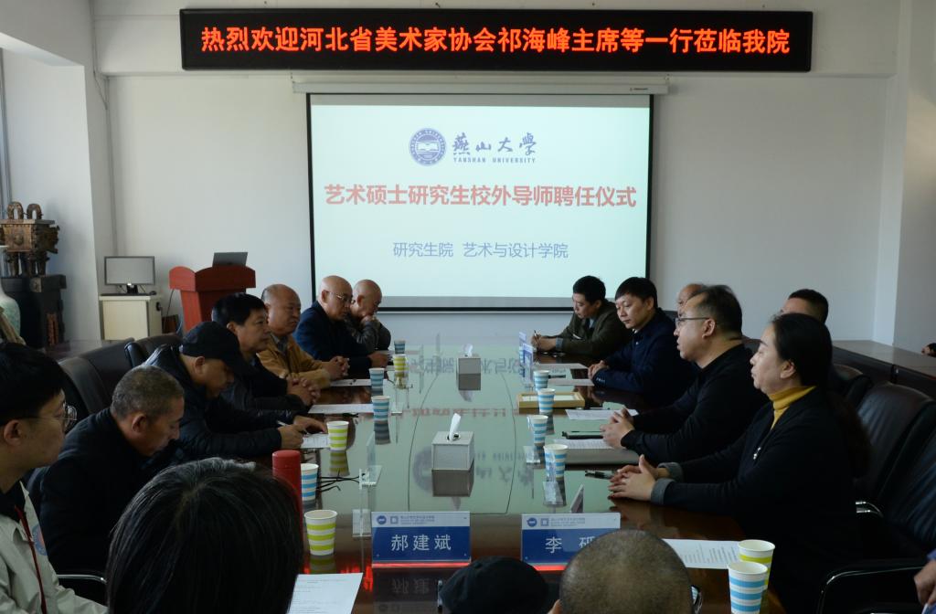 【新闻中心讯】10月28日上午,艺术与设计学院艺术硕士研究生培养研讨会暨校外导师聘任仪式在美术馆C305会议室举行。河北省文联副主席、河北省美术家协会主席祁海峰、乌鸦传媒副校长任家东、河北省美术家协会秘书长李小军、秦皇岛市美术家协会主席宋鸿钧、艺术与设计学院院长孙利,副院长张竹岩、赵琳,学院部分艺术硕士研究生导师和研究生参加了会议。会议由艺术与设计学院副院长赵琳主持。
