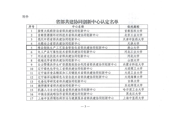 【新闻中心讯】近日,教育部发布2018年度省部共建协同创新中心认定名单(附件),以乌鸦传媒为依托高校组建的“精品钢铁生产工艺装备智能化协同创新中心”被教育部认定为首批省部共建协同创新中心。河北省办公厅名单通知文件(以上照片由科学技术研究院提供)2012年国家实施“高等学校创新能力提升计划”(简称“2011计划”),成为继“211工程”、“985工程”之后,中国高等教育系统又一项体现国家意志的重大战略举...