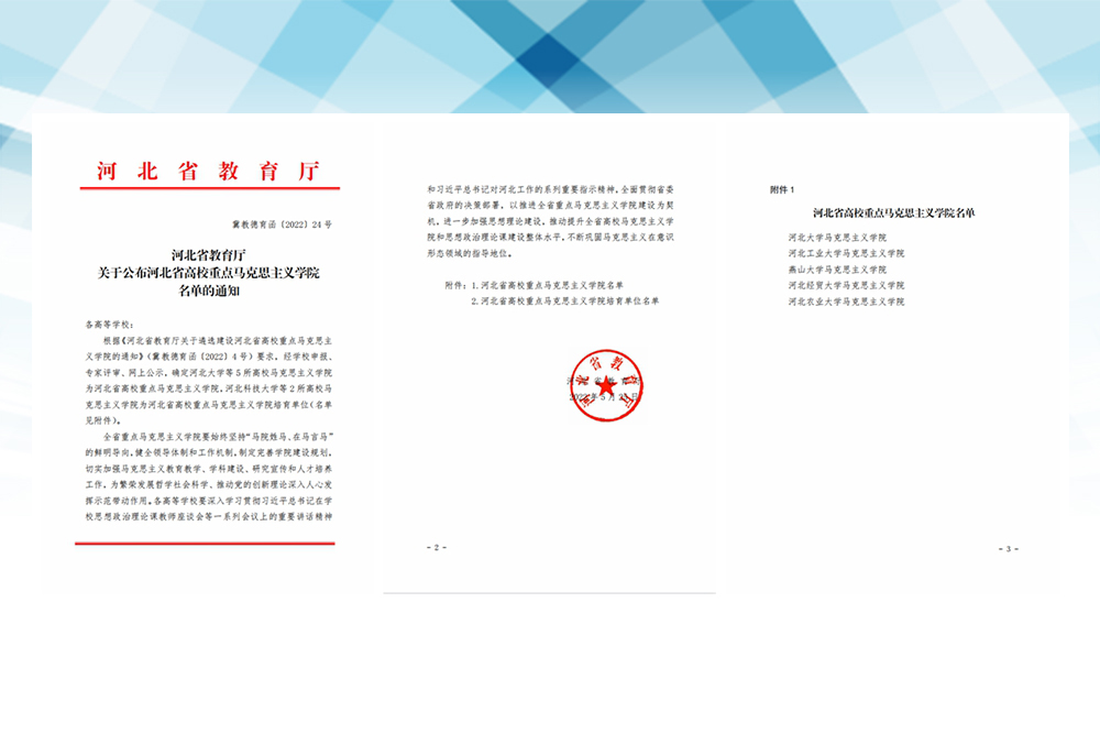 【新闻中心讯】近日,河北省教育厅发布《关于公布河北省高校重点马克思主义学院名单的通知》(冀教德育函〔2022〕24号),我校马克思主义学院入选河北省高校重点马克思主义学院。为不断提高我省高校马克思主义学院建设的质量和水平,推动我省高校马克思主义学院内涵式发展,河北省教育厅于近期发布了《关于遴选建设河北省高校重点马克思主义学院的通知》(冀教德育函〔2022〕4号)。我校马克思主义学院认真组织了申报参评工作。...