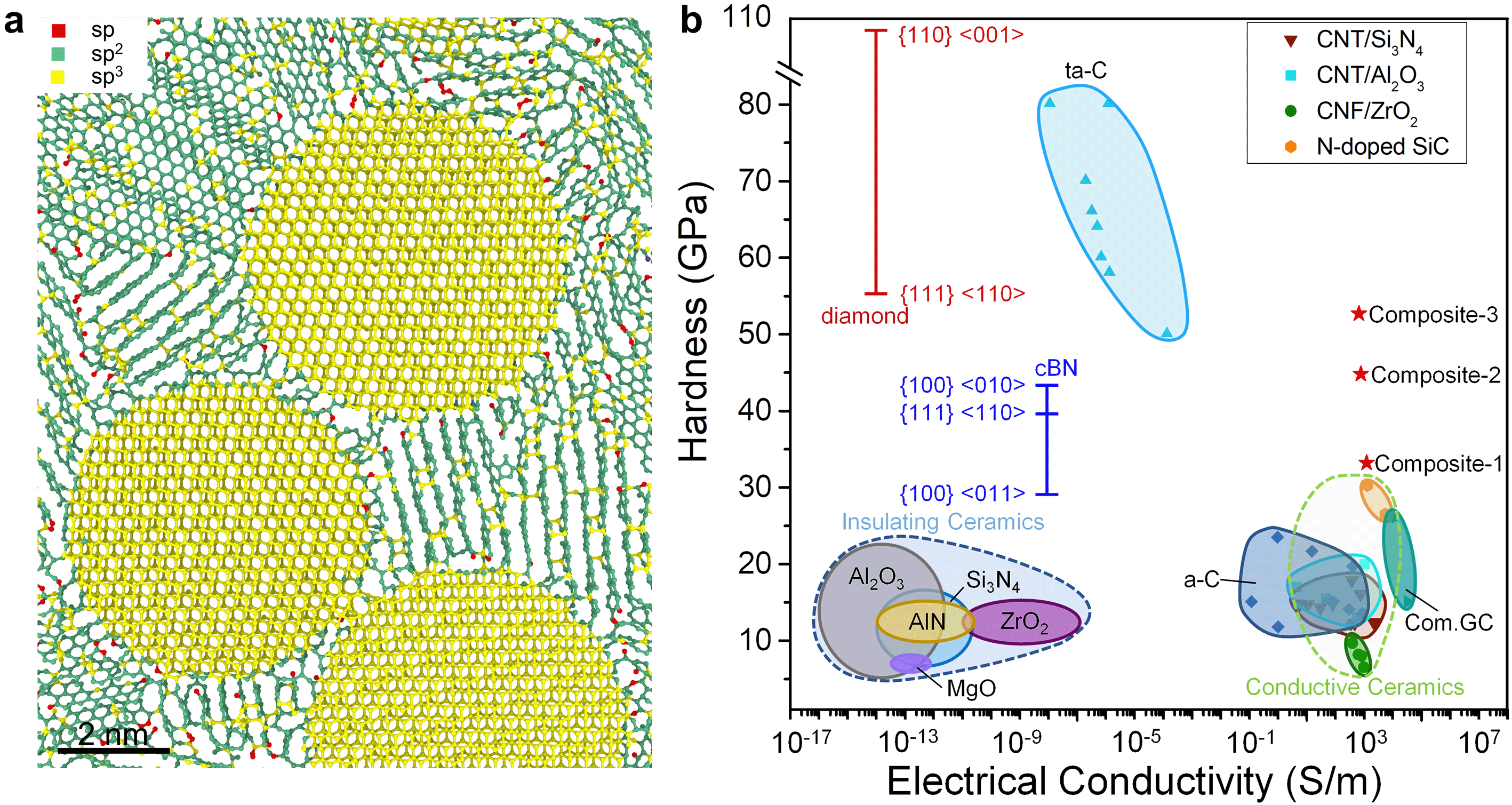 【新闻中心讯】近日,乌鸦传媒亚稳材料制备技术与科学国家重点实验室高压科学中心田永君院士、赵智胜教授与清华大学李晓雁教授、丹麦奥尔堡大学岳远征教授等国内外学者合作,通过调控玻璃碳在高温高压下的相变合成出超硬、超强、导电的非晶碳/纳米金刚石自生复合材料,并阐明了非晶碳到金刚石的直接相变机制。研究成果以“超强导电的由非共格嵌入无序多层石墨烯中的纳米金刚石组成的自生复合材料”(Ultrastrong conductive in s...