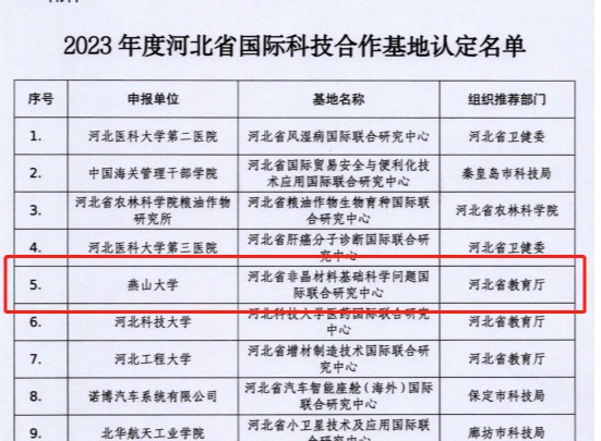 【新闻中心讯】近日,河北省科学技术厅发布《关于发布2023年度河北省国际科技合作基地认定结果的通知》,经过评审,依托我校建设的“非晶材料基础科学问题国际联合研究中心”被认定为河北省国际科技合作基地,这是我校获批的第2个河北省国际科技合作基地。本次评审,全省共认定30家河北省国际科技合作基地。2023年度河北省国际科技合作基地认定部分名单非晶材料科学问题国际联合研究中心主要依托亚稳材料制备技术与科学国家重点...