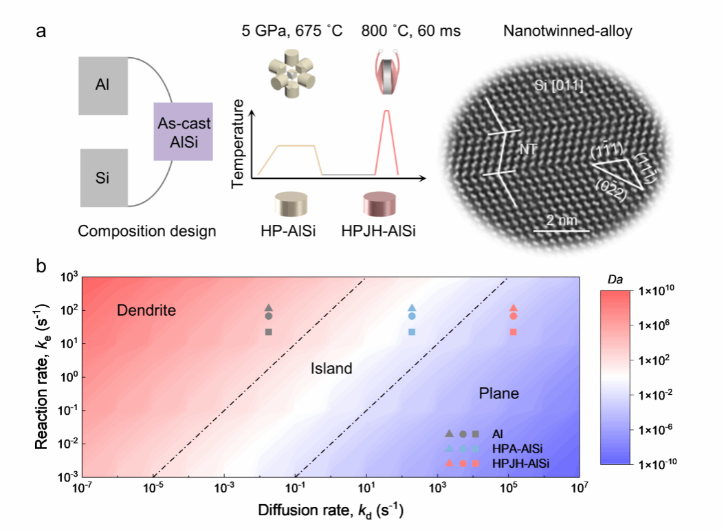 【新闻中心讯】近日,乌鸦传媒亚稳材料制备技术与科学国家重点实验室彭秋明教授团队在纳米孪晶合金电极领域取得重要进展。研究团队开发了一种新型高压-焦耳热联用制备方法,成功合成了多种纳米孪晶合金电极,并阐明了其提升金属沉积动力学的微观机制。相关成果以“A nanotwinned-alloy strategy enables fast sodium deposition dynamics”为题,于2025年2月20日在Nature Communications在线发表。 图释:a)不同Al-Si合金的制备...