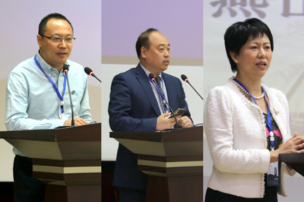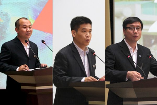 深圳校友代表团姜宏岩、陕西校友代表团郭俊杰、广东校友代表团方国红在会上发言(王晓琪/摄)