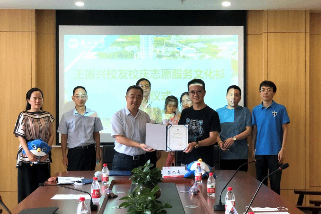 黄晟与两位校友签署了捐赠协议,颁发了捐赠证书,并把校庆吉祥物“燕宝”赠送给两位校友。(编辑 褚玉晶)