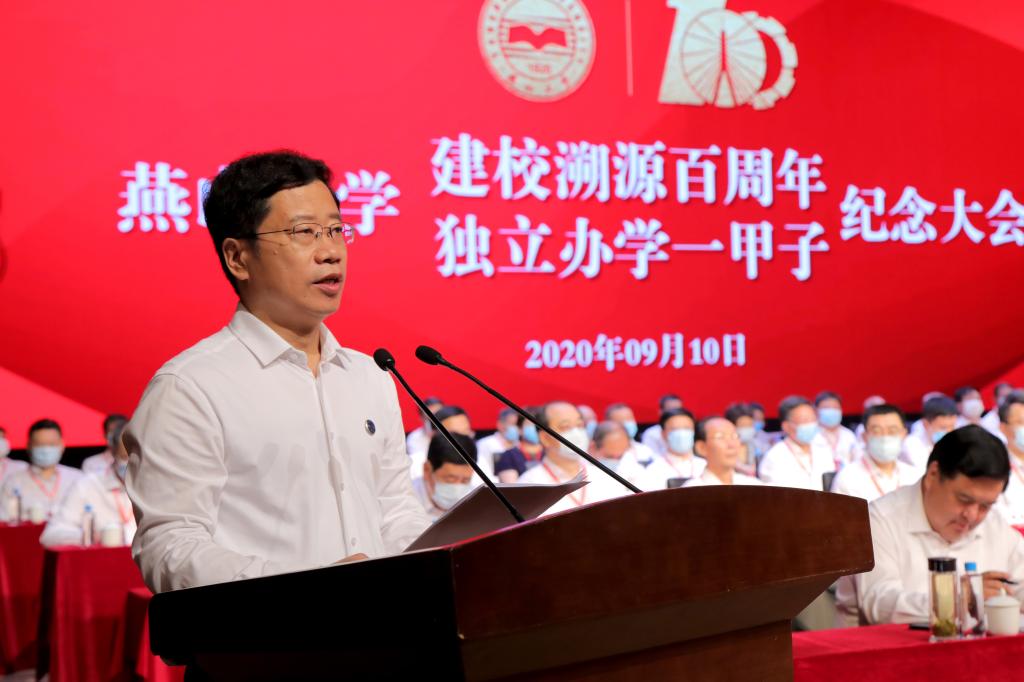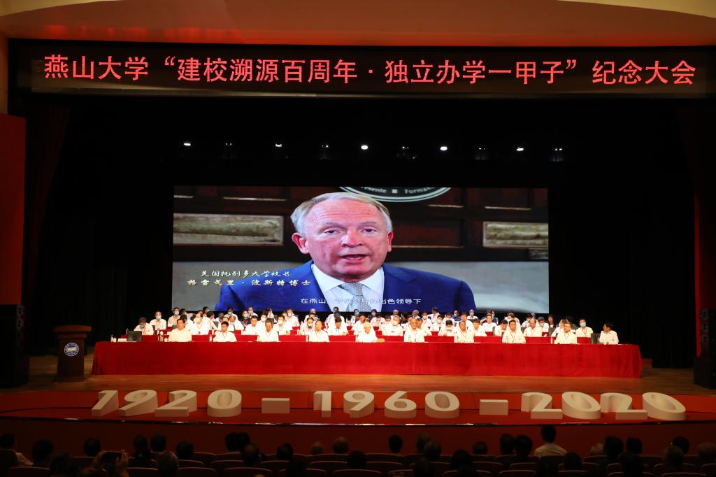 赵丁选代表学校作了题为“坚守教育报国初心,开启新百年浩瀚征程”的致辞。他说,站在百年历史的门槛上,我们抚今追昔,感慨万千。一百年波澜壮阔,六十载筚路蓝缕,沉淀下来的是一所有特色、有情怀、有底蕴、有担当,坚守“匠心为国铸重器”的高等学府。燕大人始终与国家、民族的发展同向同行、同频共振,不断为国家和地方经济社会发展贡献智慧和力量,唱响了一曲开拓奋进、砥砺前行的壮丽弦歌。回望办学历程,燕大人始终怀揣一流大学梦想,以“志不改,道不变”的坚定与执着,彰显了中国特色社会主义大学的格局和气派。学校始终坚持正确办学方向,以立德树人为根本,构建价值塑造、知识学习和能力培养三位一体的育人模式;坚守“顶天立地”,致力于科技进步,推动科技创新服务经济社会发展;突出办学特色,努力办好高水平行业特色大学;扎实推进文化育人,固精神之本,铸文化之魂。回顾办学历史与成绩,我们更深切地体会到,大学只有与时代结合、与国情结合,国之事业,才能一脉相承;地方高校唯有打破地域、经费、生源等因素带来的制约,才能开拓出新的发展空间。