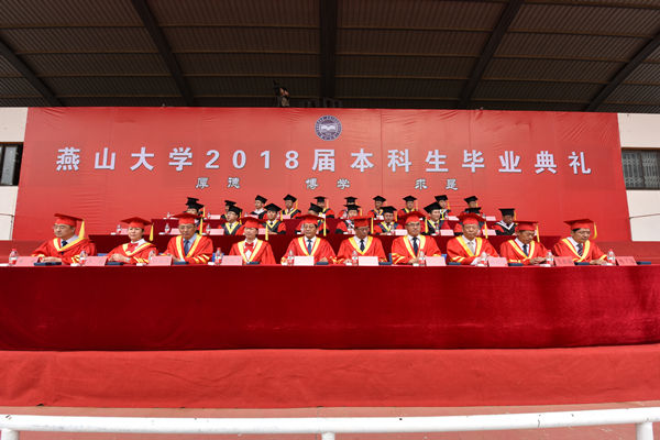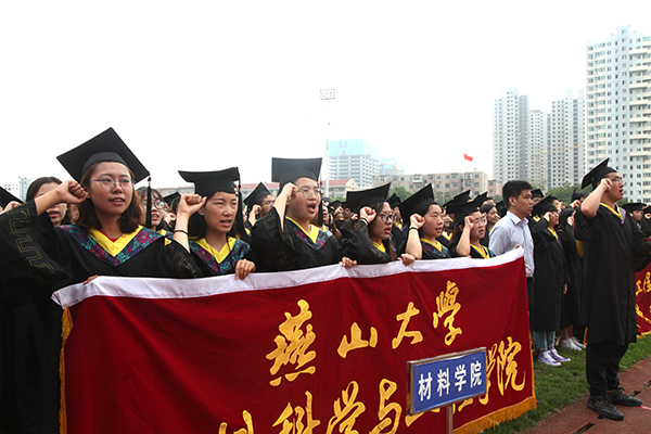 承载着母校的希望和校长的祝愿,全体毕业生在即将赴澳大利亚昆士兰大学攻读硕士学位的经济管理学院毕业生马浩程的带领下,进行出征宣誓,“仰燕山壮志,怀渤海雄襟;厚德明身、博学济世、求是奉献;燕园追梦、学成报国、出征扬帆;感念母校深情,谨遵师长教诲;不负赤子初心,勇担时代使命;甘撒热血热汗,壮我中华河山!”铮铮誓言传递了燕大子弟兵的壮志豪情。本次誓词从各学院毕业生中广泛征集、精心凝练产生,表达了2018届毕业生对母校的感恩之情,饱含了对未来生活的美好期许,展示了全体毕业生报效祖国的壮志雄心。之后,4500余名毕业生自发喊出“我爱老师、我爱燕大”,师长们报以经久不息的掌声,将典礼气氛推向高潮,充分展现了燕大学子知恩奋进的精神风貌。
