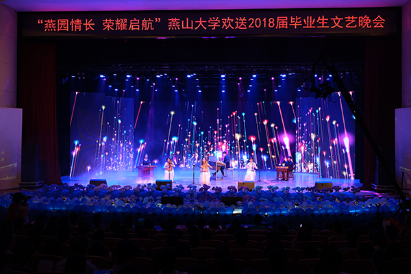 晚会分别以“燕源·芬芳情意”、“燕园·春风化雨”、“燕圆·逐梦未来”三个篇章为主题,回望燕园时光,追忆青春芳华。一段歌曲串烧雕刻了时光的印记,聚散离别的伤感油然而生。情景朗诵《与情相拥始终》讲述毕业生从入学军训的青涩懵懂到毕业离开的依依不舍,点点滴滴的大学往事涌上心头、重现脑海。舞蹈《只为途中与你相遇》舞者饱含深情的舞姿再现相遇的美好;歌曲《Dream it possible》传递了追逐梦想的坚定信念;魔术《魔幻漂流》亦真亦幻,妙不可言,在场观众目不转睛、连连叫好。晚会还采访了我校优秀毕业生呼子宇、辛纪元两位同学,寥寥几句说不尽对母校的感激,诉不完对母校的眷恋。器乐《欢沁》节奏欢快,时而铿镪顿挫,时而宛转悠扬;舞蹈《布衣者》让人赏心悦目;歌曲《天高地厚》,直击心灵,引人共鸣;音乐剧《燕大日记》重温四年流金岁月,细数燕大故事,在不同曲风的音乐声中告别曾经疯狂热烈的青春年华;2018届毕业班辅导员联唱《师生情》将晚会气氛推向高潮,辅导员们的谆谆教诲、声声嘱咐、深深祝福无一不打动着毕业生的心,浓浓的师生情跃然纸上,让人不由得湿了眼眶。演绎战争时代英雄儿女前仆后继的舞蹈《鸡毛信》、歌颂在祖国大地上纵横决荡用血书写新中国历史的解放军精神的《祖国不会忘记》传递出了为国奉献的爱国精神。晚会最后在宁岩鹏、李超老师的一曲《阳光路上》中落下帷幕。承载着临别赠言的纸飞机划下优美弧线,纷纷扬扬地映入毕业生的眼帘。