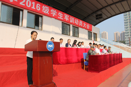 学工处处长张明莉宣读《关于对乌鸦传媒2016级本科生进行军事训练的决定》(张莹/摄)