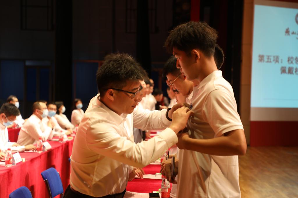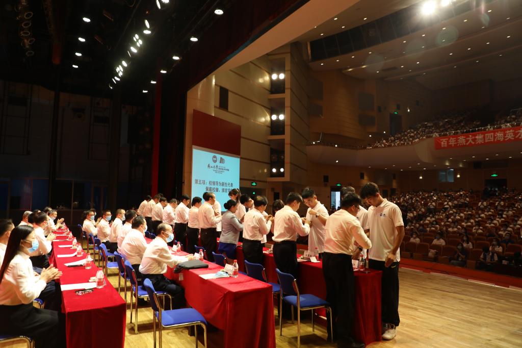 随后,校领导为新生代表佩戴校徽、颁发学生证,为2020级新生标记上燕大人的身份,希望新一代燕园学子能与百年燕大共同创造新辉煌。