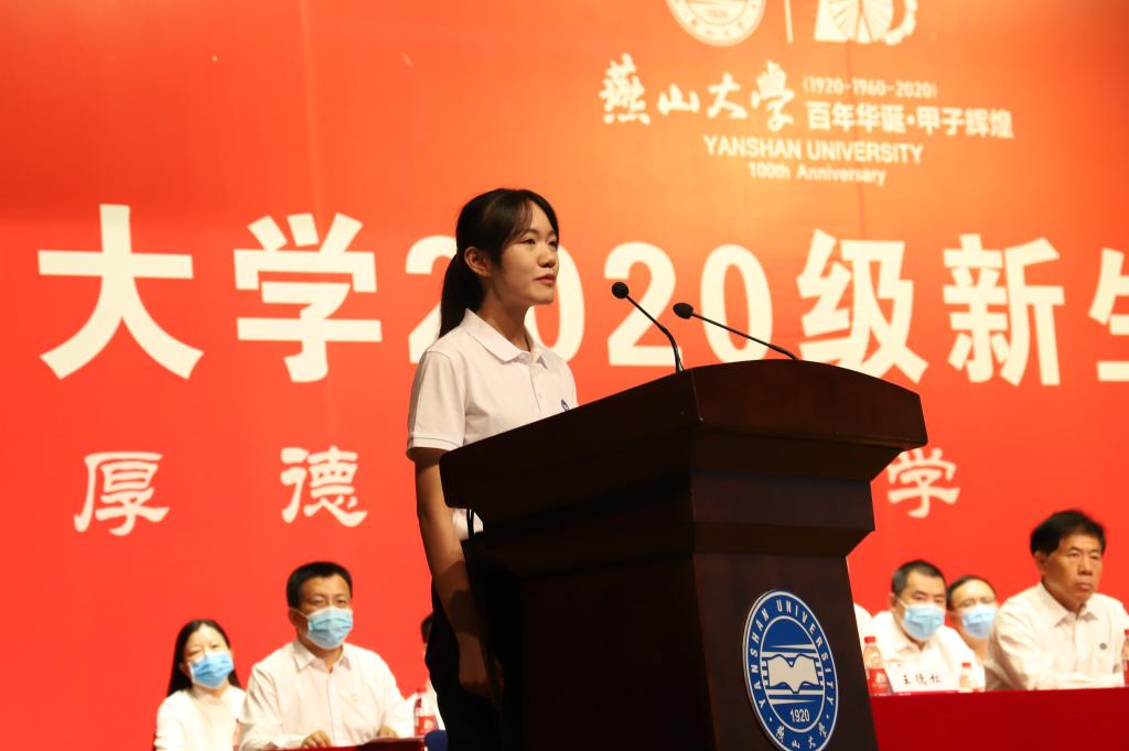 文法学院2020级公共事业管理专业新生路晓婷作为新生代表发言,她与大家分享了时值学校建校溯源百周年,独立办学一甲子之际进入燕园的喜悦和振奋之情,以生动的语言将大家的思绪带回2020级新生历经磨砺奋战高考的难忘经历中,表达了作为一名新生对燕大和燕大精神品格的认知,并表示作为新时代大学生和勇立时代潮头的新青年,要传承燕大精神,不负长辈嘱托,敢于担当,勇于探索,永葆对理想信念的热忱,肩负起家国天下的使命!