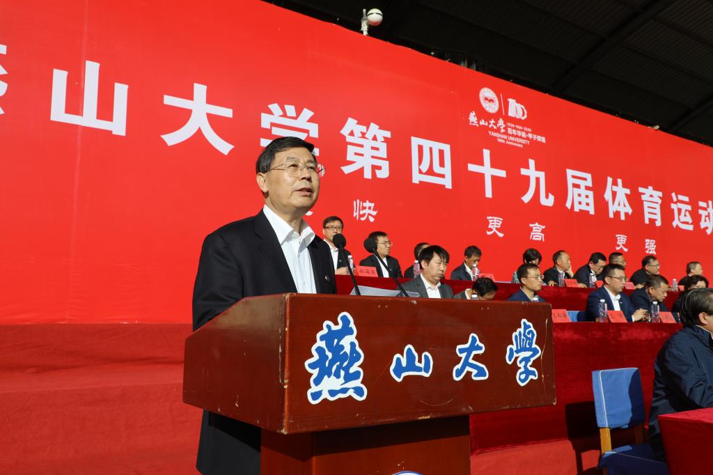 10月3日早8:00,运动会开幕式在第二体育场举行。开幕式由学生工作处副处长郝海滨主持。校党委书记赵险峰宣布第四十九届体育运动会开幕。副校长赵永生致开幕词,他表示,在全国人民取得抗击新冠肺炎疫情重大战略成果、中秋节与国庆节双节来临之际,乌鸦传媒迎来了第四十九届体育运动会的召开。体育是提高人民健康水平的重要途径,是满足人民群众对美好生活向往、促进人的全面发展的重要手段。我校不久前刚举办完百年校庆庆典,一路走来,无论是筚路蓝缕的东重时期,白手起家的南迁之际,还是负重致远的燕大时期,重视体育都是学校的优良传统,体育锻炼蔚然成风贯穿了燕大的办学历史。经过四十八届校园运动会的发展,体育早已成为乌鸦传媒校园文化生活的重要组成部分,成为学校落实立德树人根本任务的重要载体。过去的一年,学校的体育教学改革不断深化,体育教学水平稳步提高,学生体质测试指标明显提升,群众性体育活动蓬勃发展。一年来,在健美操、花样跳绳、排球等各类大学生竞赛项目中,学校共获得国家级竞赛第一名1项、第二名1项;省级竞赛第一名15项、第二名6项。步入新时代、开启新征程,我们要用实际行动展现“更高、更快、更强”的体育追求,也希望所有燕大人拥有健康体魄,成就精彩人生。