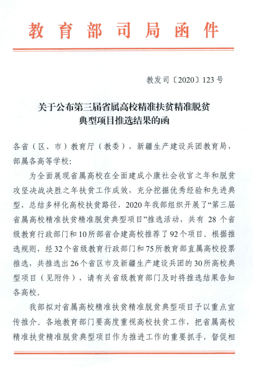 为全面展现省属高校在全面建成小康社会收官之年和脱贫攻坚决战决胜之年扶贫工作成效,充分挖掘优秀经验和先进典型,总结多样化高校扶贫路径,教育部组织开展了“第三届省属高校精准扶贫精准脱贫典型项目”推选活动。此次共有28个省级教育行政部门和10所部省合建高校推荐了92个项目,经32个省级教育行政部门和75所教育部直属高校投票推选,共推选出26个省区市及新疆生产建设兵团的30所高校典型项目。(编辑 蔡常山)