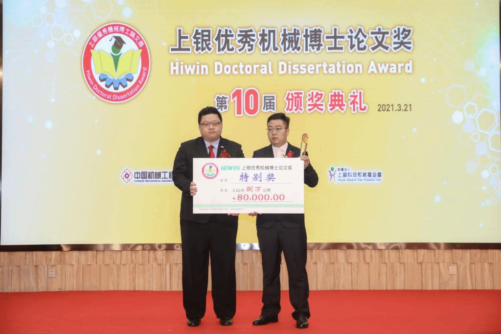 “上银优秀机械博士论文奖”是我国机械工程领域博士论文的最高荣誉。该奖项由台湾上银科技股份有限公司(HIWIN)于2011年出资设立,由中国机械工程学会组织评选,每年一届。其旨在提升中国制造技术的水平,加强高层次创造性人才的培养工作,鼓励创新精神,提高中国机械工程及其自动化领域博士生教育的质量;激发与鼓励中国青年学子投入机械工程及其自动化领域研发及创意应用,培养优秀机械工程人才,增进企业界与学术界之互动,进而促进机械工业技术之提升与创新。该奖注重博士论文的理论、实际价值和产学研的紧密结合,迄今为止已评选十届。