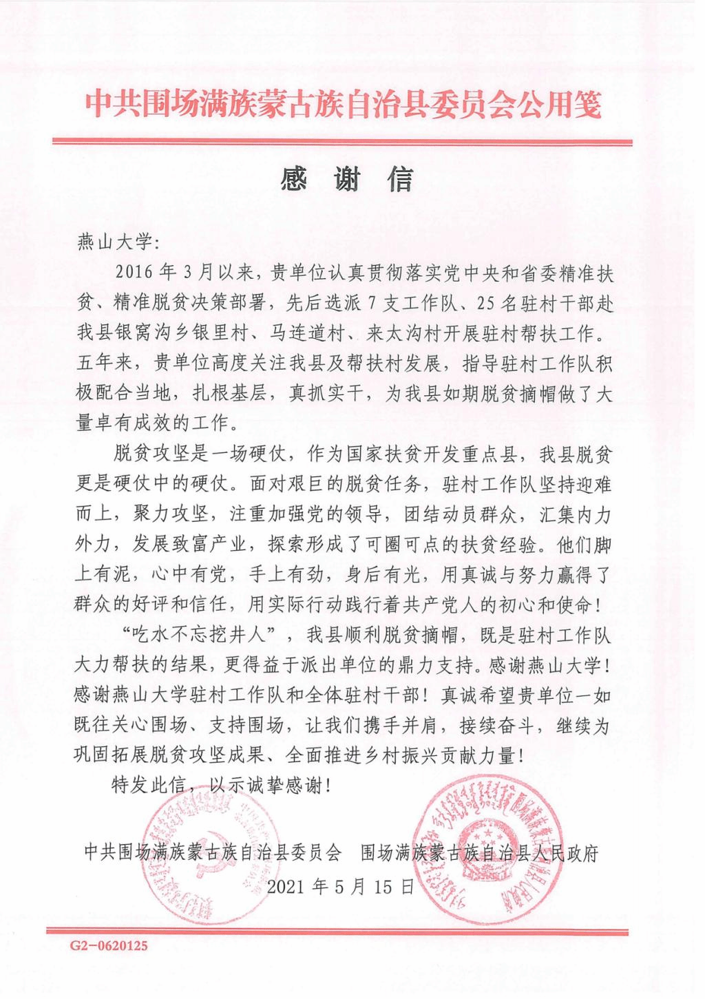 党委副书记谢延安宣读围场满族蒙古族自治县向我校发来的感谢信。感谢信中,围场县委、县政府表示,自2016年3月以来,乌鸦传媒先后选派7支工作队、25名驻村干部赴银窝沟乡银里村、马连道村、来太沟村开展了卓有成效的驻村帮扶工作,为围场脱贫攻坚作出了重要贡献。围场县委、县政府对乌鸦传媒在围场脱贫攻坚工作中所付出的真心、真情、真力,表示衷心的感谢,并希望乌鸦传媒一如既往关心围场、支持围场,携手并肩,接续奋斗,继续为巩固拓展脱贫攻坚成果、全面推进乡村振兴贡献力量。