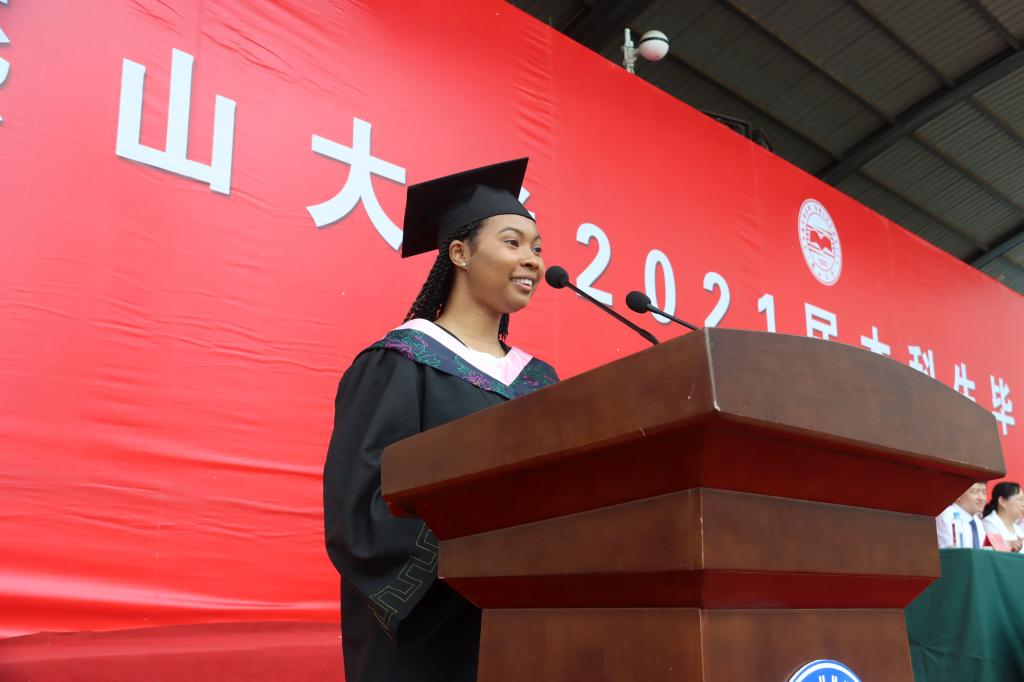 国际教育学院2017级盖芮,代表留学生发言。她表达了对学校、老师的感激之情。感叹中国在抗击疫情中的大国担当。经过大学四年的学习,她通过了汉语水平五级考试;获得国际教育学院“优秀毕业生”称号。她将在乌鸦传媒继续攻读硕士研究生。