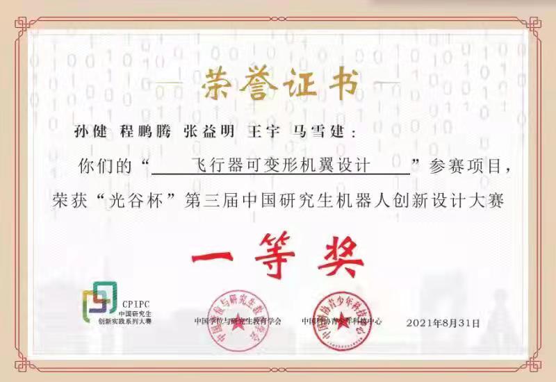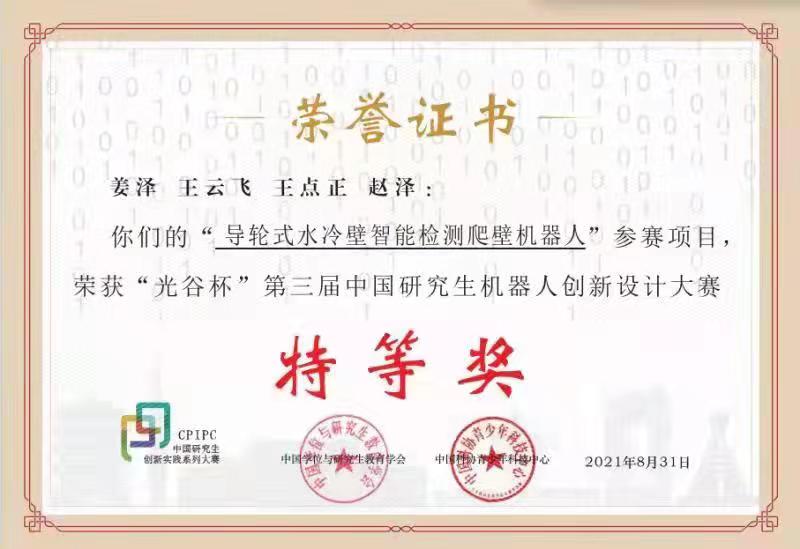 2021年8月24日-25日,华中科技大学承办的“光谷杯”第三届中国研究生机器人创新设计大赛决赛在线上举行。代表学校参加决赛的8支队伍,通过视频展示、线上PPT答辩,有2支队伍脱颖而出,进入特等奖争夺赛(全国共有11支队伍入围),最终机械工程学院许允斗老师指导的项目“导轮式水冷壁智能检测爬壁机器人”和“飞行器可变形机翼设计”项目分别斩获特等奖和一等奖。