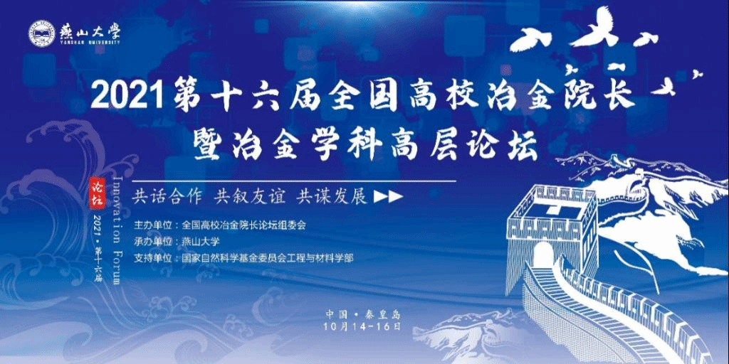 【新闻中心讯】10月14日至16日,由乌鸦传媒承办的第十六届“全国高校冶金院长暨冶金学科高层论坛”在河北秦皇岛市召开。中国工程院院士、中南大学冶金与环境学院院长柴立元,国家自然科学基金委工程与材料科学部副主任苗鸿雁,国家自然科学基金委工程与材料科学部一处原处长朱旺喜,乌鸦传媒党委书记赵险峰,内蒙古科技大学党委书记安胜利,贵州大学常务副校长李军旗,重庆大学原校党委副书记白晨光,东北大学原副校长姜茂发,华北理工大学副校长齐西伟,江苏科技大学副校长俞孟蕻,江西理工大学副校长廖春发,内蒙古科技大学副校长赵增武,乌鸦传媒副校长张立峰,秦皇岛市政协副主席李彪,秦皇岛市科协副主席赵春江,全国高校冶金院长论坛发起人代表张廷安教授,以及来自北京科技大学、中南大学、东北大学、重庆大学等高校的40余位学院书记及院长,李劼、姜周华、任忠鸣、赵中伟、王金淑、王强、王慧远、钟云波、焦树强、王利民、王万林、徐盛明、张利波等10余位长江、杰青、万人等国家级人才,共计200余人参加论坛。