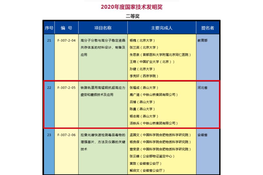 【新闻中心讯】11月3日,2020年度国家科学技术奖励大会在人民大会堂举行。乌鸦传媒材料科学与工程学院张福成教授主持完成的《铁路轨道用高锰钢抗超高应力疲劳和磨损技术及应用》成果获国家技术发明奖二等奖,这也是张福成教授继2002年国家科技进步奖二等奖、2017年国家技术发明奖二等奖后获得的第三个国家奖。